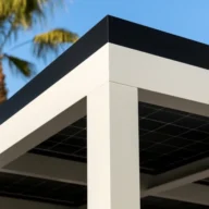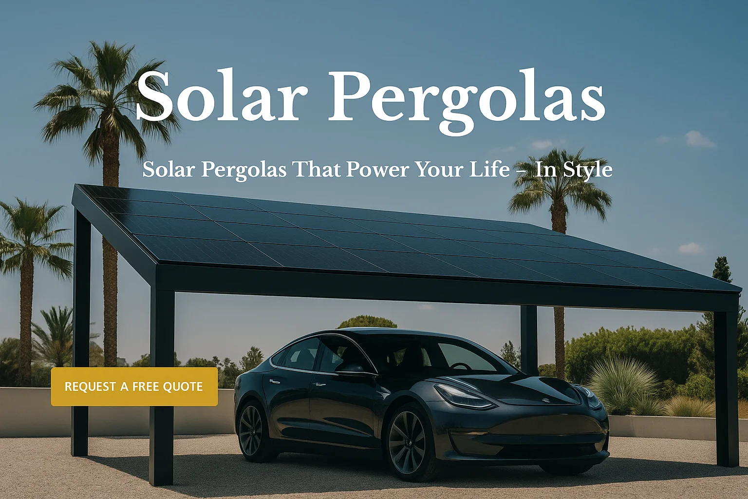 Una estructura independiente que convierte la zona de aparcamiento en pieza arquitectónica: columnas de aluminio sobredimensionadas, vidrio solar full-black y cableado invisible.